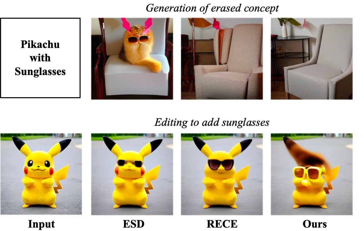 では, 画像生成の他にlayout-to-imageやsupre-resolution, inpaintingなどのタスクが扱われています. ここで, inpatingは画像を用意してその一部分を変化させる画像編集のサブタスクと考えられます. この論文では画像編集にも焦点を当てて概念消去を行います. 論文のFigure 1 (b)にある図を示します. ここでは, 他の概念手法がtext-to-imageのPikachuしか消去できていないのに対し, 提案手法であるACEはtext-to-imageの他にもimage editingでも消去ができています. 既存手法はtext-to-imageしか考えていないので本当の意味で概念消去ができたわけではないということになります (あらゆる入力に対して概念消去ができているわけではない, という意味です).