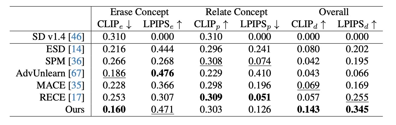 - 消去をCLIP Scoreで測定することはやはり無理があるように思えます. あくまでテキストと画像の類似度を見るので全然似てない画像を出力するように訓練すればそこだけいいスコアを出すことは容易だからです.
