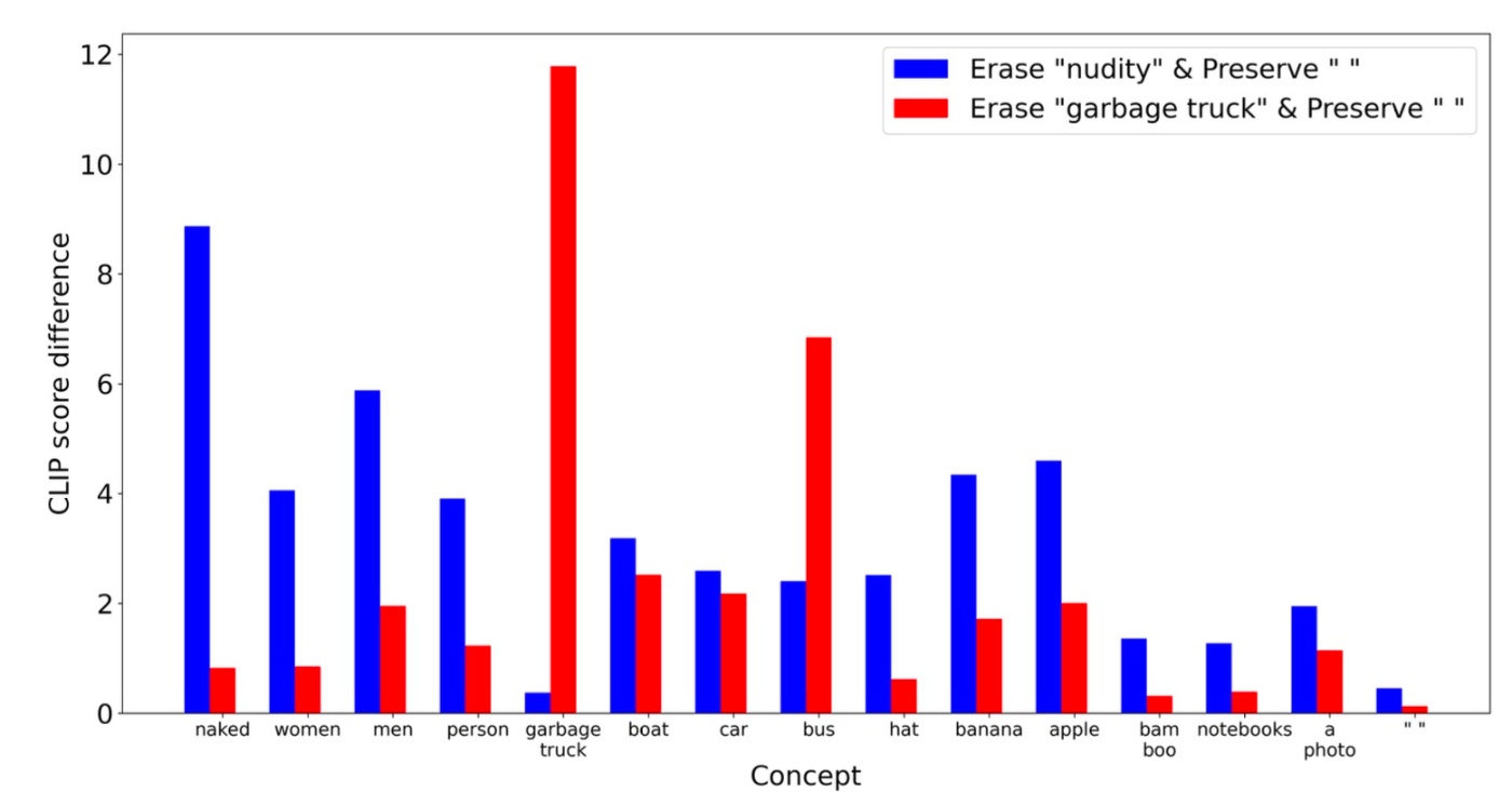 著者らはある概念を消去した際に, どの概念に影響が及ぶかに関心があります. 先ほどの例ですと, nudityではpersonやwomenに影響があると言えます. しかし, 一般にこれを特定することは困難です. そのため, 既存研究ではnull promptをもちいたりして解決を試みます. しかしながら, そのような手法はあまり解決策になっていないように著者らは考えているようです. ここではその経験的根拠を示していきます.
