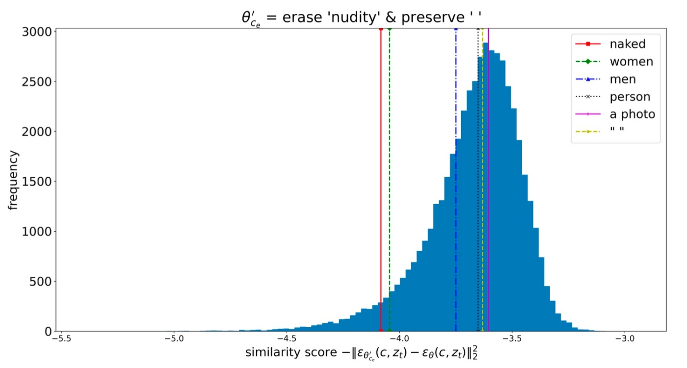 ここからわかることとして, 類似度が幅広く分布していることが挙げられます. これは概念消去が他の概念の生成に与える影響が大きく異なることがわかります. 類似度が低いと2つのモデルの出力は異なり, よりsensitiveであると言えます. 注目すべき点として, "women"や"men"といった関連性の高い概念はnull promptのような中立的概念よりもnudityの削除にsensitiveです.