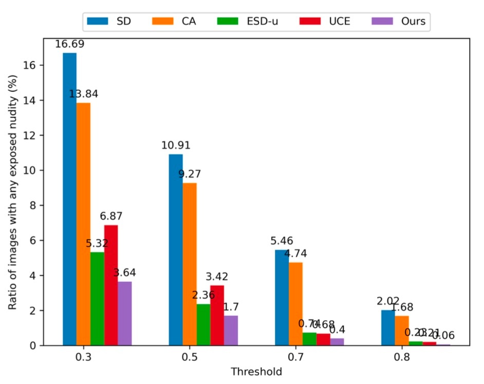 閾値を変えた時の結果を表にしてみます. さっきまであったOriginal SDが消えていることが気になりますが, それは置いといて (本文中にはNER-0.3のみ書かれていて, 16.7です.), UCEはESDもかなり下がっていて手法の有効性が示唆されます. それよりも提案手法はもう一段階スコアが改善されています. しかも, FIDも一番いいです. FIDについてはMSCOCO 30Kですが, 急に出てきた感があります. FIDが他の概念への影響度を表していると考えるのであれば他の概念の生成能力は変わらないという意味でOriginal SDのFIDも示すべきですが記載はないです.