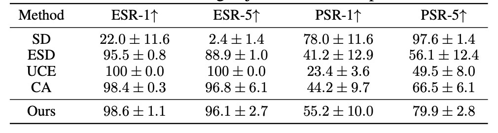 さて, それぞれの手法についてみます. 全ての手法でESRが非常に高いスコアとなっています. これはどの手法でも概念自体を消去する性能はとても高いということを示しています. 一方で, PSRに目を向けてみると話は大きく変わります. 例えばESRが100%であったUCEはPSRは最も低い結果となっています. これは他の概念の維持が難しいタスクであることを示しています. それと比較すると提案手法は比較手法に対して10ポイント以上差をつけていおり, 優位性がわかります.