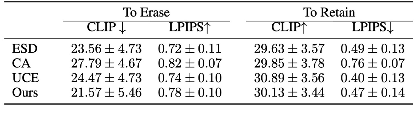 結果を見てみます. 提案手法は効果的に概念を消せていることがわかります. また, UCEには劣りますが他の概念の維持にも成功しています.