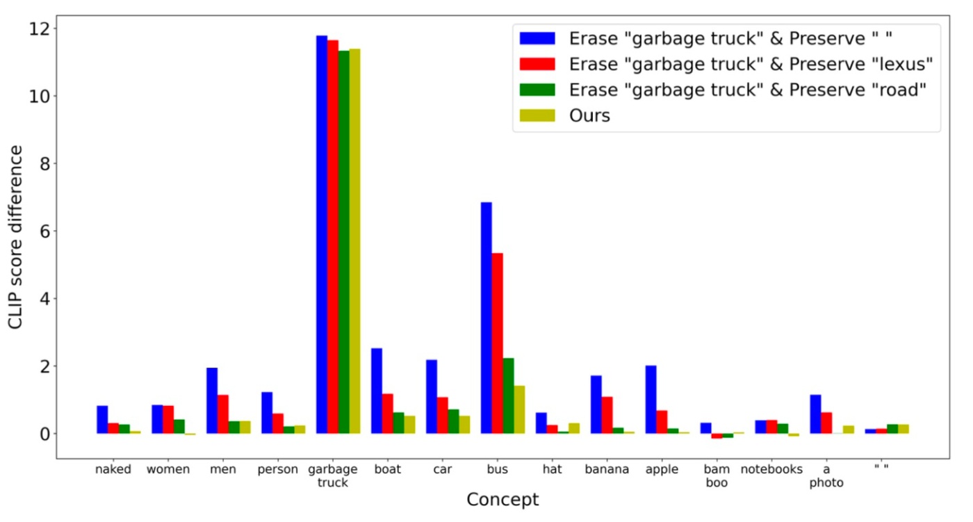 今度はこれまでの話を踏まえて, garbage truckを消す際にnull promptだけでなくlexusやroadといった概念も保持したり, 適応的にそのような概念を選んで保持したりしてみます.