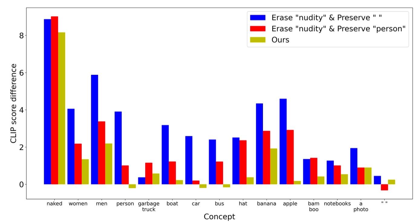 この手法は概念を消すという一点においては効果的ですが, モデルの能力を劣化させてしまいます. 例えば, nudityという概念を消した時にはwomenやpersonといったものにも影響を与えてしまいます. これを解決するために, 追加のlossを加えたりします. 例えば正則化項といったものです. しかし, 正則化項などはtarget conceptの消去とother conceptsの維持のトレードオフをうまく扱えません.