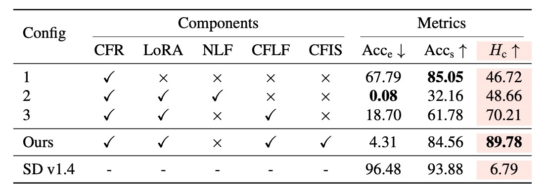 手法のところで確認したように, 3つの工夫がされていました. ここではそれらを確認します. タスクとしては有名人の消去です. 以下の表に設定が示されています. CFRはclosed-form refinement, NLFはnaive LoRA fusion, CFLFはclosed-form LoRA fusion, CFISはconcept-focal importance samplingを表します. Config 1の結果はEfficacyとspecificityのトレードオフが損なわれています. 他の概念の保持を優先した結果として消去性能が悪くなっています. Config 2では概念消去が強力である一方で他の概念に強く干渉しています. Config 3ではうまくいっていることがわかりますが, 提案手法の方がより良い結果となります.