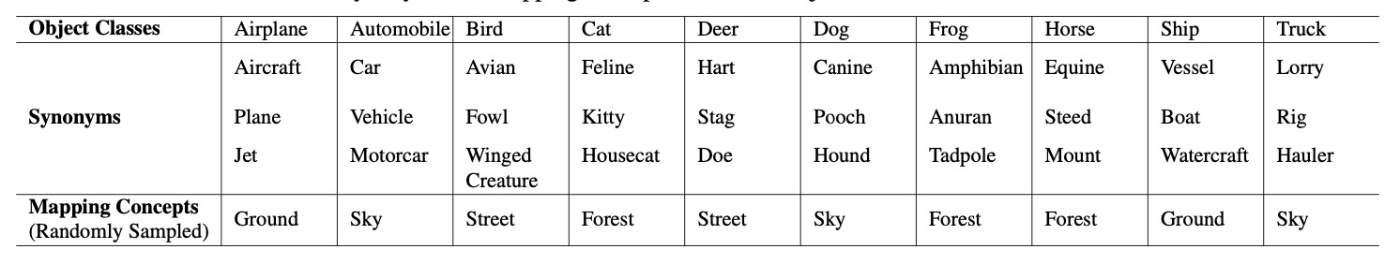 CIFAR-10のクラス名を用いて消去を行います. CLIP Accuracyを用いて評価をします. 一般性を評価するために, 消去されたクラスに関連付けられたそれぞれのsynonymについて3つのsynonymを用意します. 以下の表の通りです.
