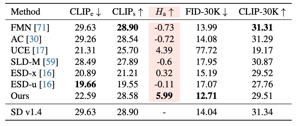 当然ですが, 提案手法であるMACEはこれらの課題に対処するものになります. UCEに似た手法を採用しており, cross-attentionを閉形式で記述することによってfine-tuningを行います. しかし, 全体をfine-tuningすると上述の問題3に対処できないので, SPMのようにLoRAモジュールを用います. 論文の最初に示される図で結果を確認します. これまでの手法と同様の性能を確認できますが, これでは細かい部分がわからないので以降では細部を見ていきます.