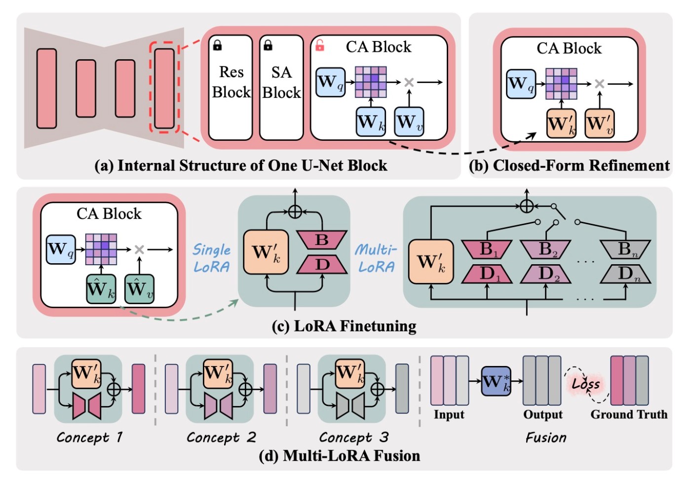 後述の実験で確認するのですが, この手法は概念消去の性能が低下します. そこで(d)にあるような新しい融合を行います. 少し離れてしまったので概要図を再掲します.