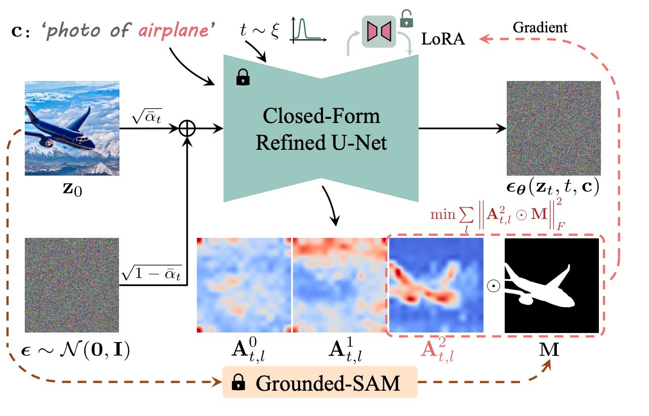 これらの手法を逆に適用することで概念消去を実現します. すなわち, 損失関数を特定概念のトークンに対応するattention mapの特定の領域の活性化を抑制するように設計します. ここで, どの領域に適用するかを識別するためにGrounded-SAMを用いて画像をsegmentationして行います. それを図示すると下図になります.