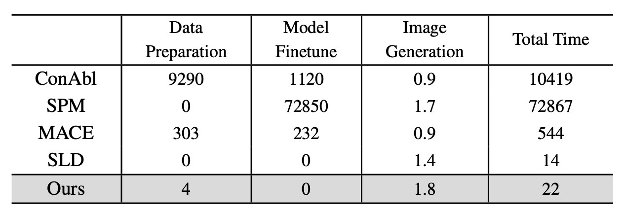 消去性能が高くてもそれを達成するまでの時間が長くては本末転倒です. ここではそれについて測定を行います. 実験は全て1枚のNVIDIA A40 GPUで行われ, 10概念を消去し10枚の画像生成を行います. まず, 一般に概念消去には3つの工程があります.
