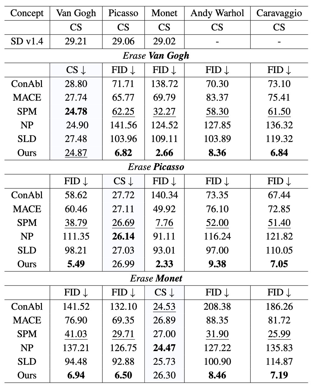 Gogh, Picasso, Monetを消去します. objectとは異なり, 単一概念の消去のみを行います. まずは定量評価の結果を確認します.