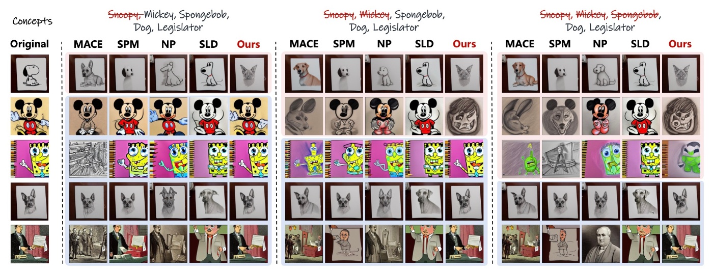 論文ではSnoopyの消去についてSPM, NP, SLDはできていないと書かれていますがSPM以外はSnoopyと主張するのは難しいように見えます (論文には「耳や形状などの特徴が残っている」とされていますが, その特徴を満たしてかつSnoopyとは言えないキャラクターも作ることができそうなので個人的には無理があるように見えます. 特にNPなどは人に見せてもSnoopyとは言わないように思えます.). これはLLM-as-a-Judgeとか使えばある程度の信頼性ができそうです. ただ, 隣に移動してMickeyとの同時消去の結果をみるとNPとSLDの2手法ともMickeyを消去できていなさそうです. MACEについてはSnoopyの消去時点でなぜかSpongebobの生成結果が破綻してしまいました.