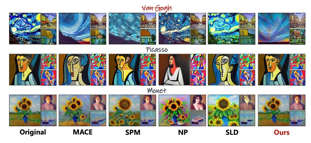 NPは定量評価からも分かるように, CLIP Scoreはいい場合が多いですがGogh styleの消去はできていなさそうに見えます. これはSLDも同様です. この2手法は他の概念 (Picasso, Monet)にも大きく影響を及ぼしています.