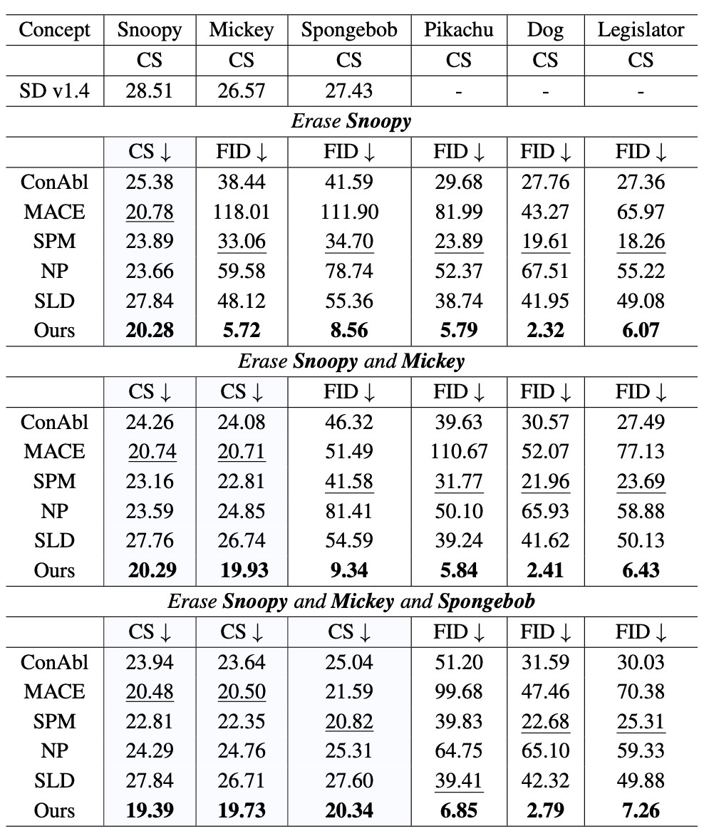 論文ではspecific instancesと書かれていますがobjectsのことです. 単一概念としてSnoopyを消去し, その次にSnoopyとMickey, さらにその次にSnoopy, Mickey, Spongebobの同時消去を試します. まずは定量評価から見ます.