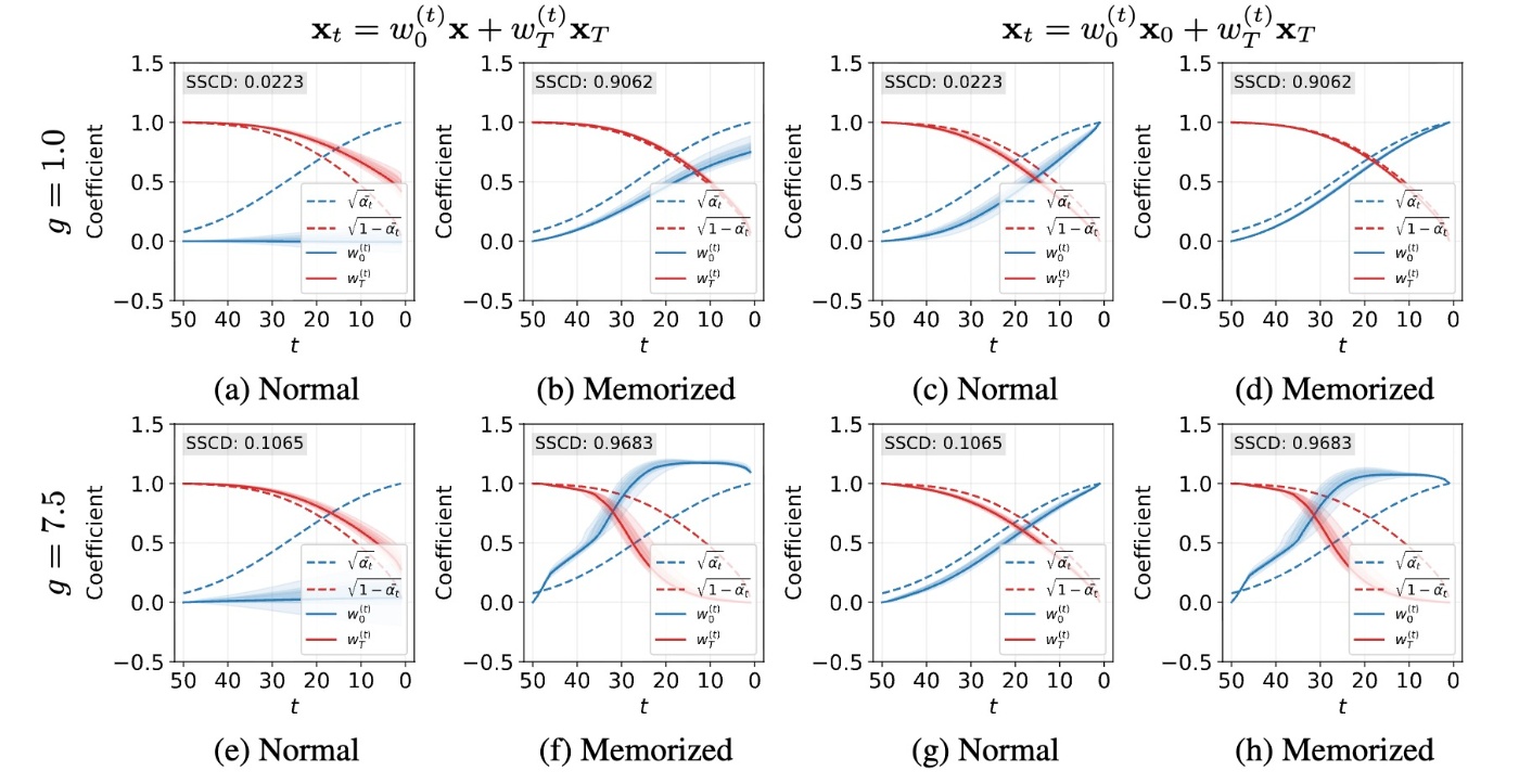 こちらは \bold{x} が未知の場合です. \bold{x}_0 を訓練画像 \bold{x} の代わりに用いた場合の結果です. 通常のプロンプト場合(図c, g)は理論的なスケジュール通りの変化をしています. これは図(a, b)でdenoisingの際に強化される成分が \bold{x}_0 で, denoisingの経路のゴールが早い段階で定まり, denoising中に徐々に増幅されていることを意味しています. memorizationが発生している場合はCFGがないときは理論的なスケジュールに一致し, あるときは w_0^{(t)} が急速に増加して w_T^{(t)} が急速に減少しています. これもdenoisingの初期段階で \bold{x} が過大評価されていることを示しています.