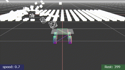 投げ飛ばすものは小さい球で、弾数と射出間隔、ライフタイムを設けてます。弾数を制御して処理落ちにならないように、射出間隔を調整して連射になりすぎないように、弾のライフタイムで回収して再利用(再度放出)するようにしてます。途中で弾切れになるのは、偶然とはいえよいアクセントになったかなと。