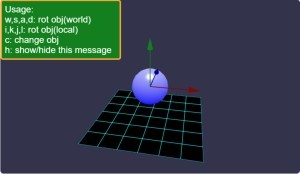 text1.text = "Usage:\nw,s,a,d: rot obj(world)\ni,k,j,l: rot obj(local)\nc: change obj\nh: show/hide this message";