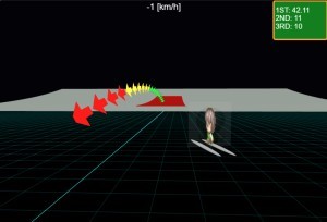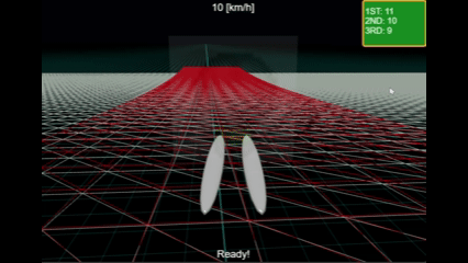 車モデルをつかって、スキーのジャンプ、傾斜を滑り降りて、ジャンプ台から飛んでみます。またジャンプ台には高さ/長さのちがう3種類の坂を用意しました。更にジャンプの軌跡をラインで示したり、ハイスコアを表示するようにしました。