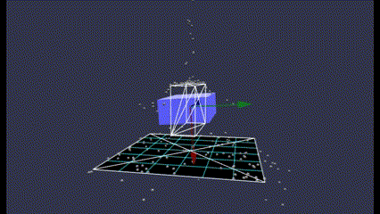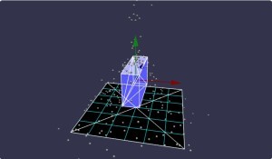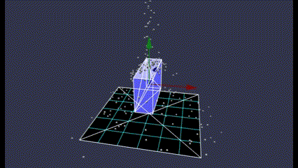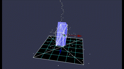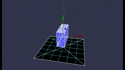 回転対象の物体として直方体(青)を表示していますが、それに対応する物理形状をワイヤーフレーム(白)で表示しています。ワイヤーフレームを表示するには、次のコードを埋め込むと良いみたいです。