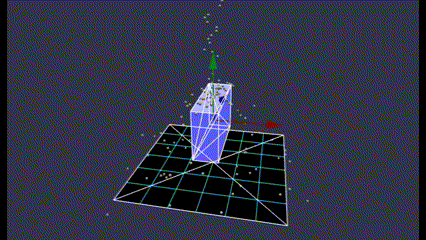 描画(青の直方体)は横に傾いたのに、物理形状(白のワイヤーフレーム)は動かず、