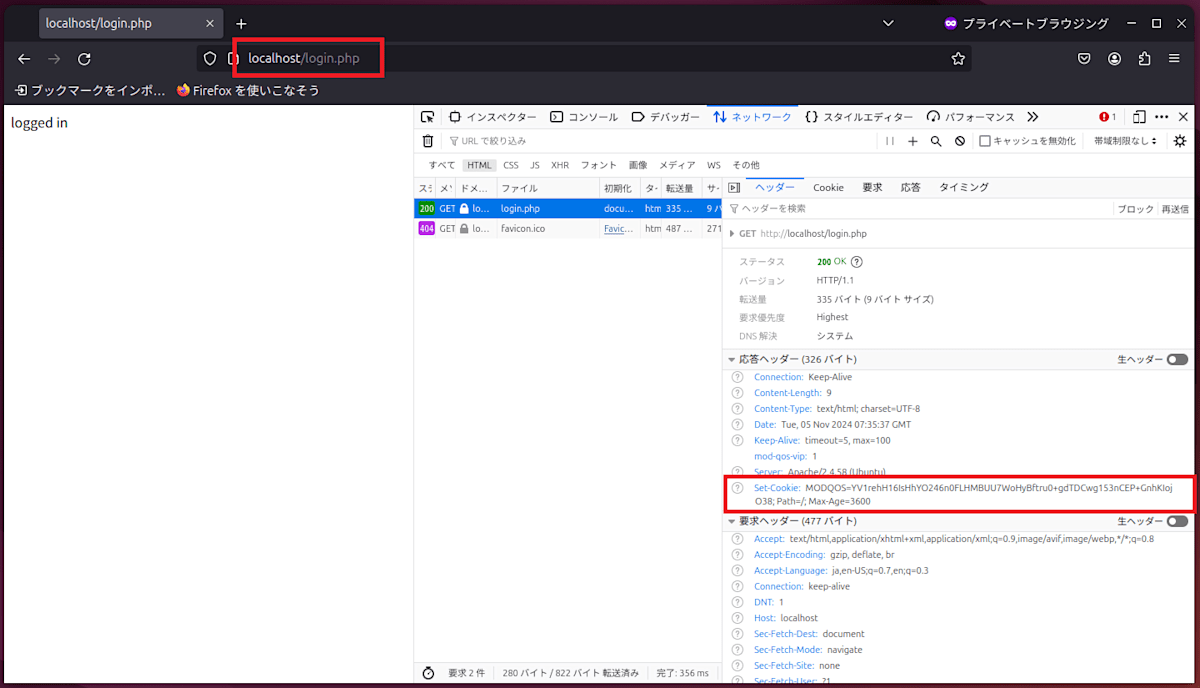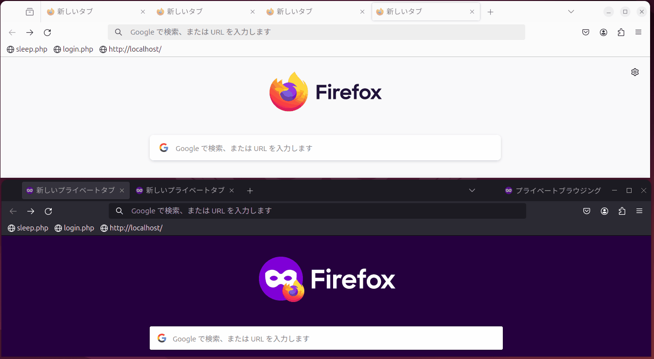 - 下側のブラウザ(プライベートウィンドウ)でlogin.phpにアクセスし、ブラウザにCookieを払い出させておく