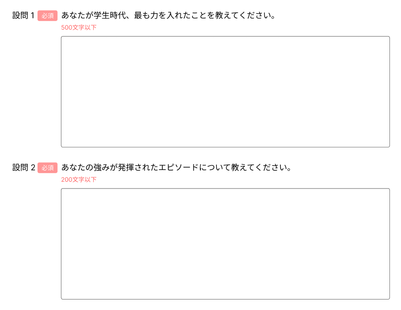 現在就職活動中で、Webエントリーシートに入力することや、Webのフォームに回答することがよくあるのですが、だいたい下の画像のような感じで設問が複数あり、文字数制限がそれぞれあるということが多いです。