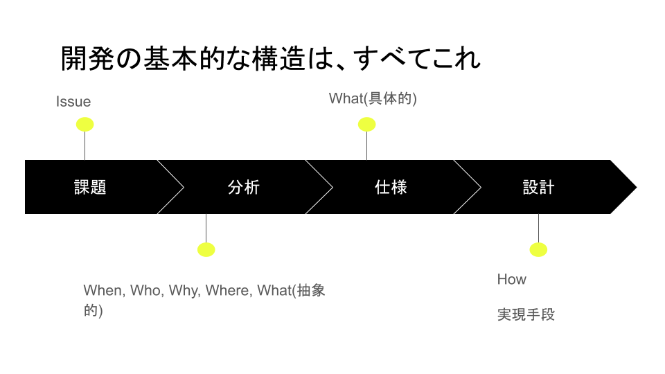ソフトウェア開発のレベルは様々ですが、実は、抽象化して考えると、必ずある構成要素に従って行われることがわかります。また、その各構成要素は、5W1Hに当てはめて考えることもできます。