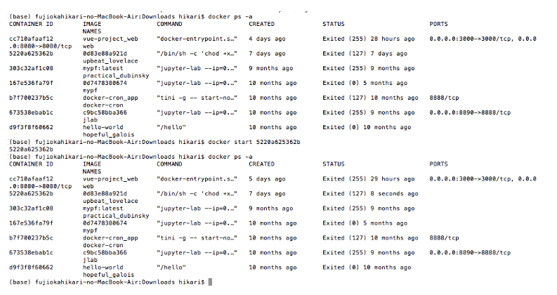 exited から running に移行するコマンドの違い