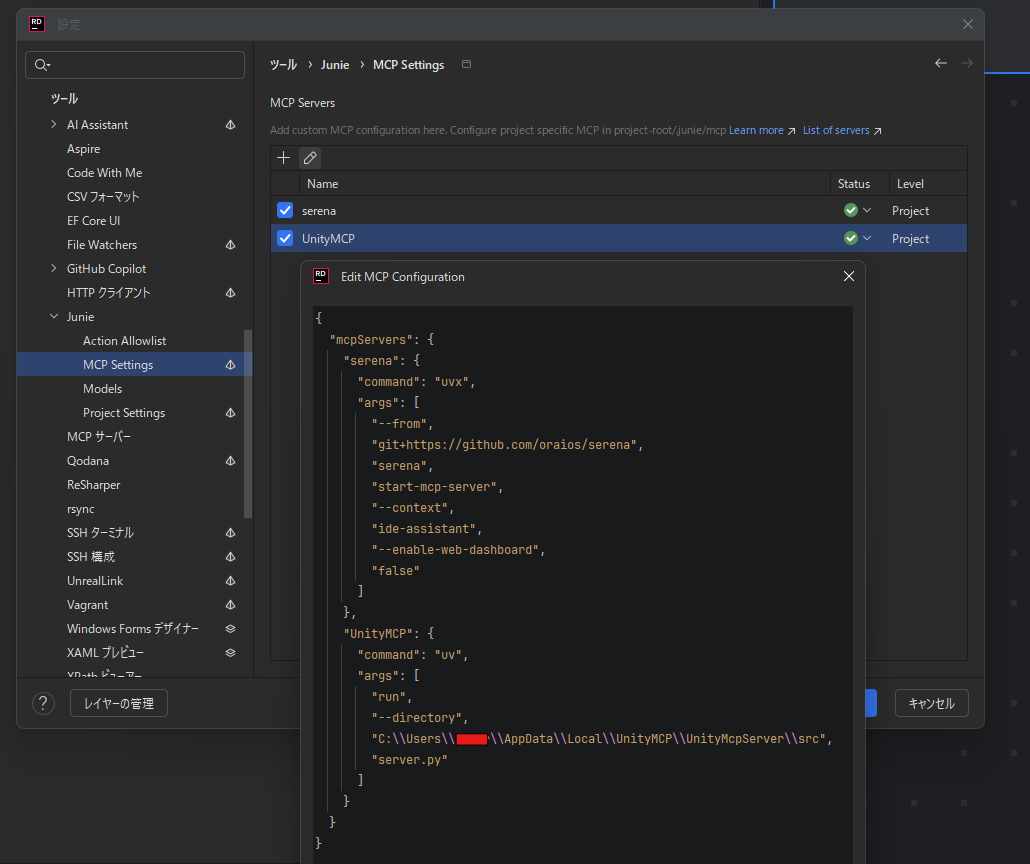 RiderでJunieのMCPとしてserenaとunity-mcpを使えるようにする