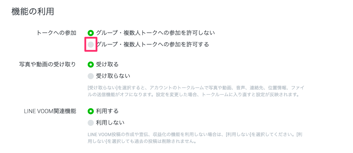 「グループ・複数人・トークの〜」の横の「編集」をクリックし、遷移先で「グループ・複数人トークへの参加を許可する」をチェックします。
