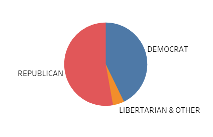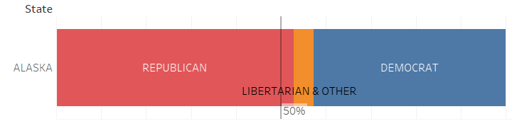 以下のバーチャートは2020年の米国大統領選挙でアラスカ州における政党別得票率を表したものです。敢えて具体的な得票数や得票率のラベルやリファレンスラインは表示していません。