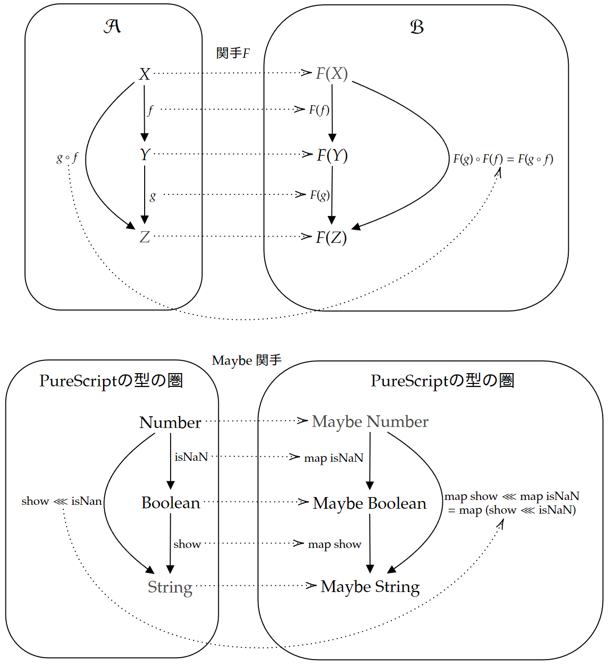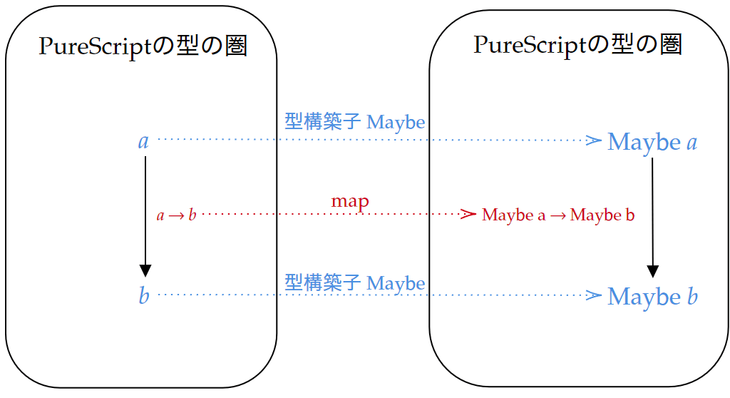 これは圏論のモナドに関わる概念からPureScript側の概念への関連の図です。