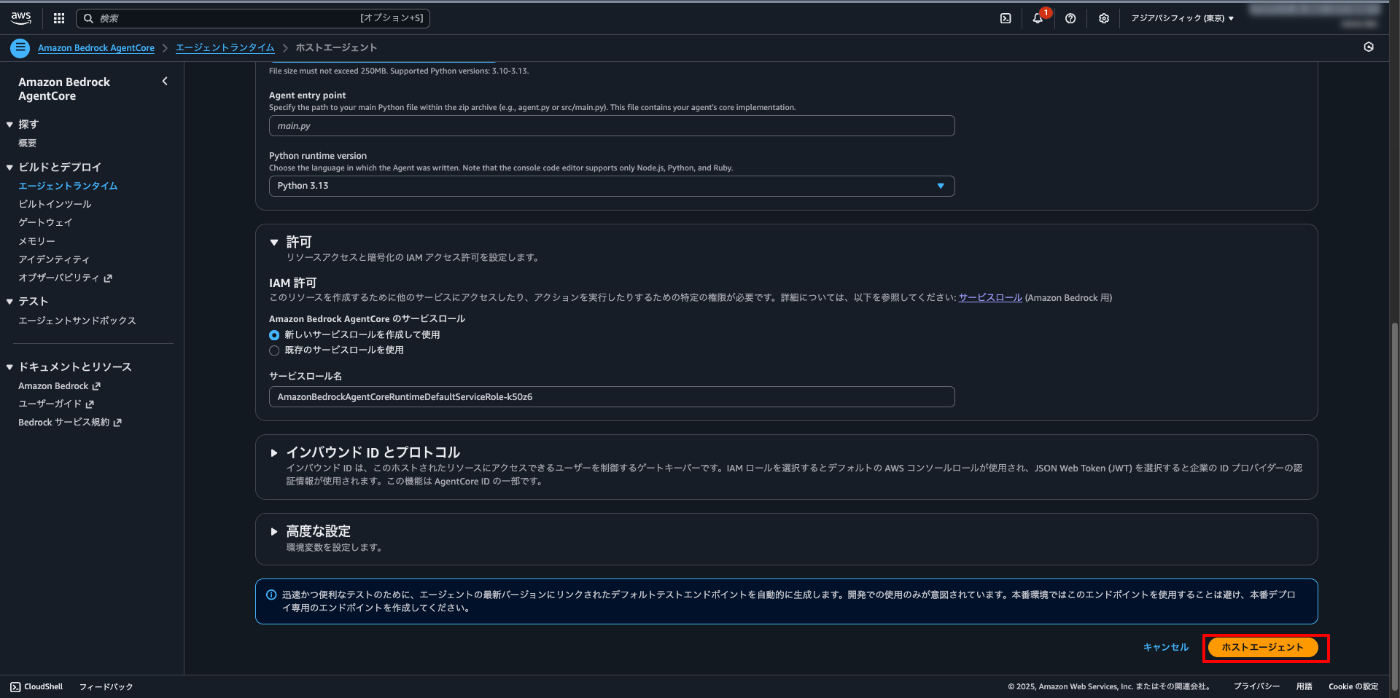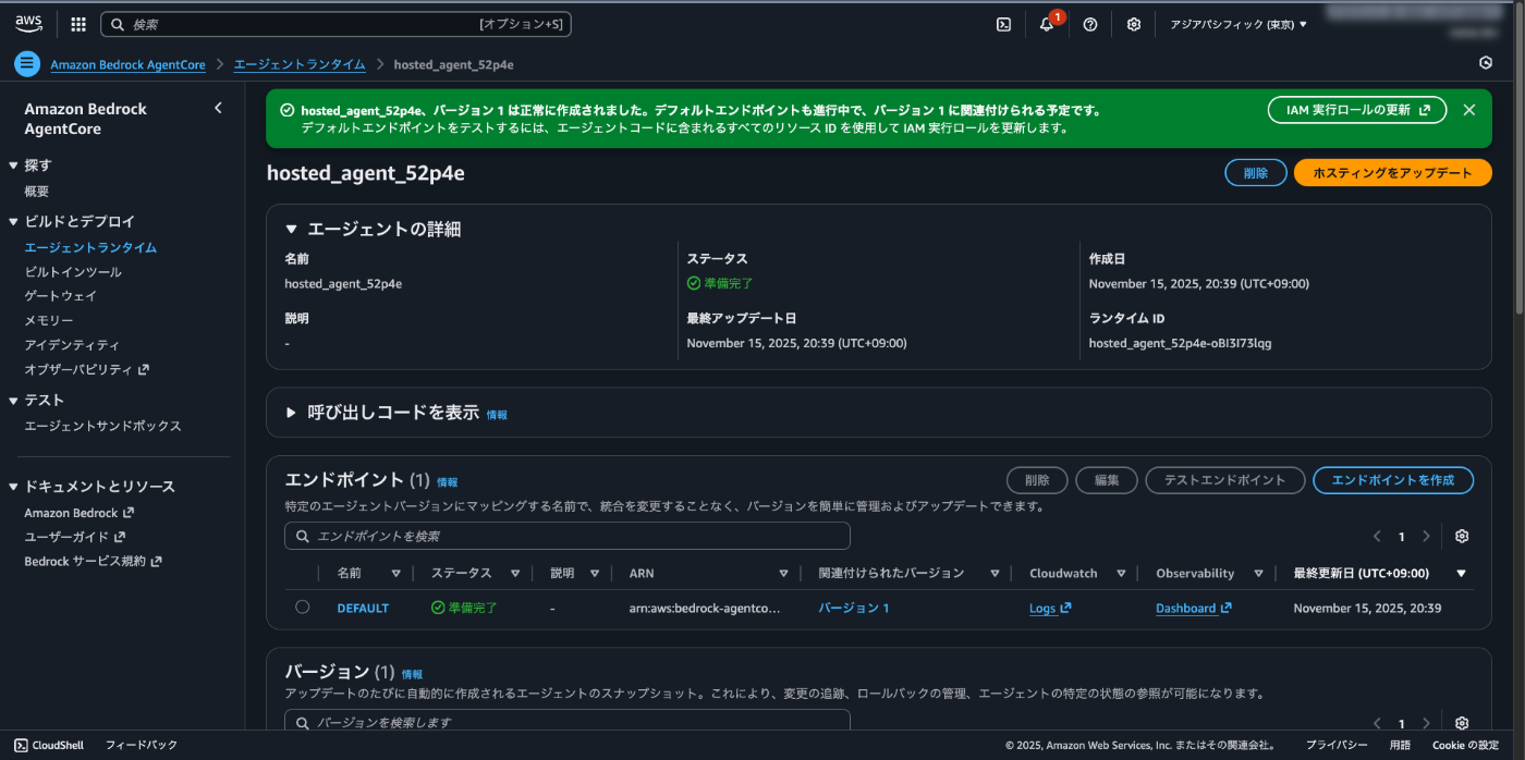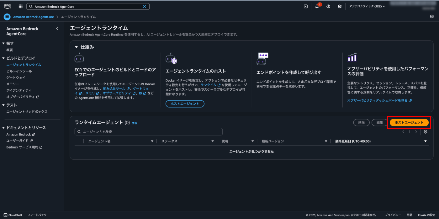 - AWSマネジメントコンソールでAmazon Bedrock AgentCoreを開く