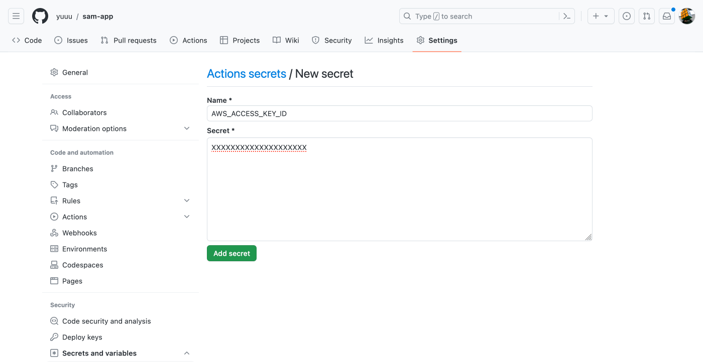 GitHubリポジトリにシークレットを作成