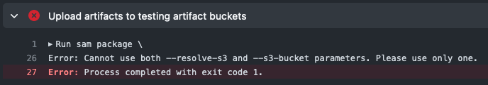 ここで Error: Cannot use both --resolve-s3 and --s3-bucket parameters. Please use only one.