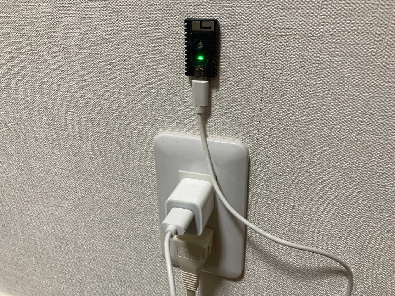 BLEゲートウェイもM5Stamp C3 Mateを使用しました。このマイコンだけでBLE通信もクラウドとの通信も実現できますし、こちらは電源の制約もないため、電池ボックスは不要、代わりにUSB type-CのケーブルとUSB電源アダプタを用意しました。