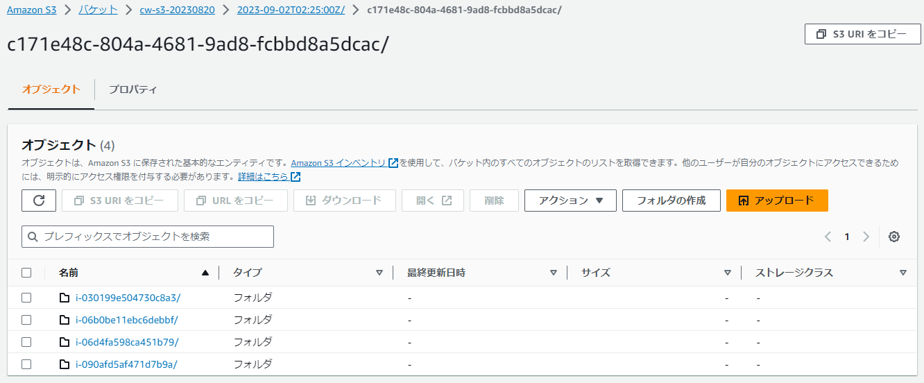 設定後、スケジュールした時間が経過したのちにS3バケットを見てみると、以下のようにスケジュール実行時間ごとにフォルダが分かれている様子が確認できます (何度か実行しているので上記スケジュール以外のものも保存されています)。