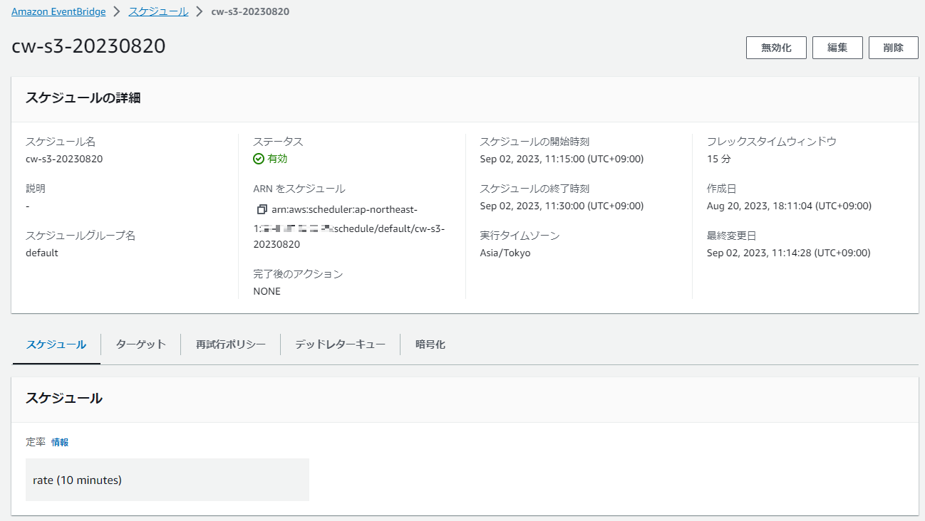 ここで EventBridge Scheduler特有のキーワードである <aws.scheduler.scheduled-time>