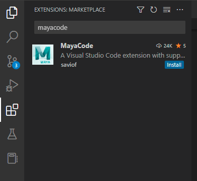 サイドバーにあるパズルのようなアイコンをクリックし、上のテキストボックスにmayaCodeと打ち込んでください。