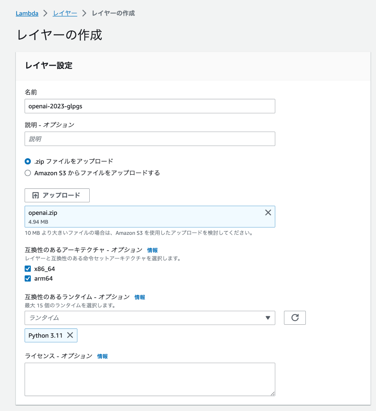 Lambda Layers を作る際に、zipファイル(10MB以内)をアップロードすれば、完成です。