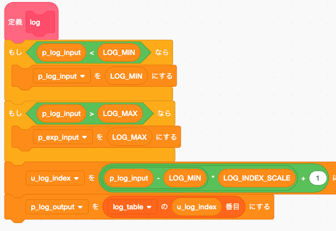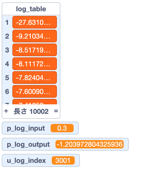 Scratchにはintキャストがないのでexp/logテーブルのindex指定に悩みましたが、試したところ2.9348 みたいなfloatをリストのIndexに指定したら勝手に小数点を切り捨ててくれたのでキモいなぁと思いつつ小数点付きの数値をリストのindexに指定する暴挙で進めます