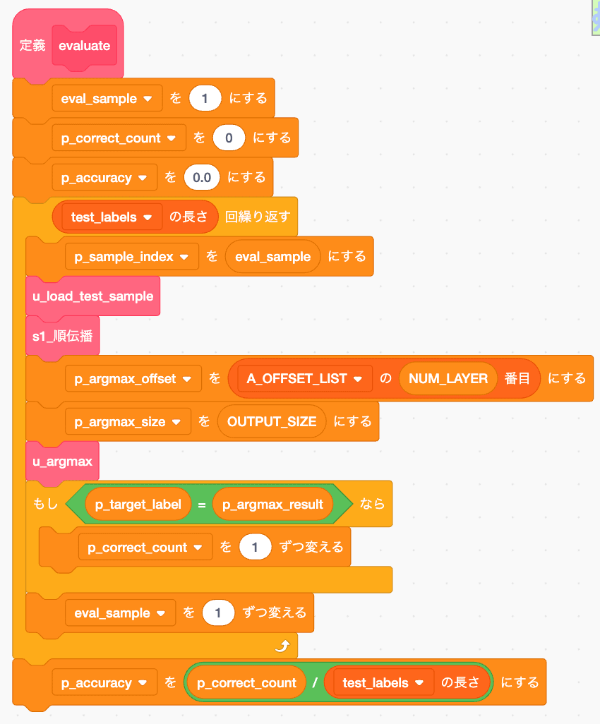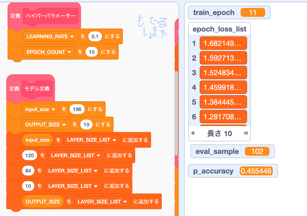 あ、そういえばここまで貼ってなかったけどこれが ここまで頑張って作った Scratch3.0で誤差逆伝播を実装した奴です