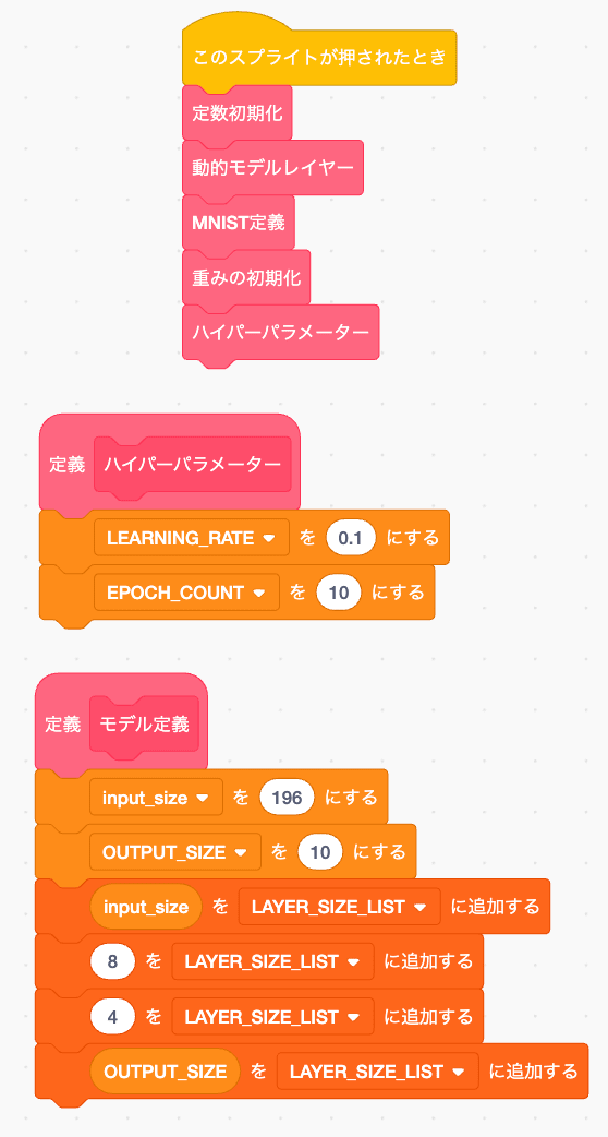 この 8とか4が隠れ層です、ここの数字や層の厚さを修正してから「このスプライトが押されたとき」を自分でクリックして初期化してください。