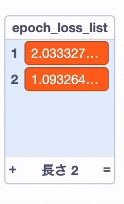 えーまあ、epoch1の時点で 14.53086とか出ていてこれはダメですね、でかすぎる、そのあとは悪化するし。