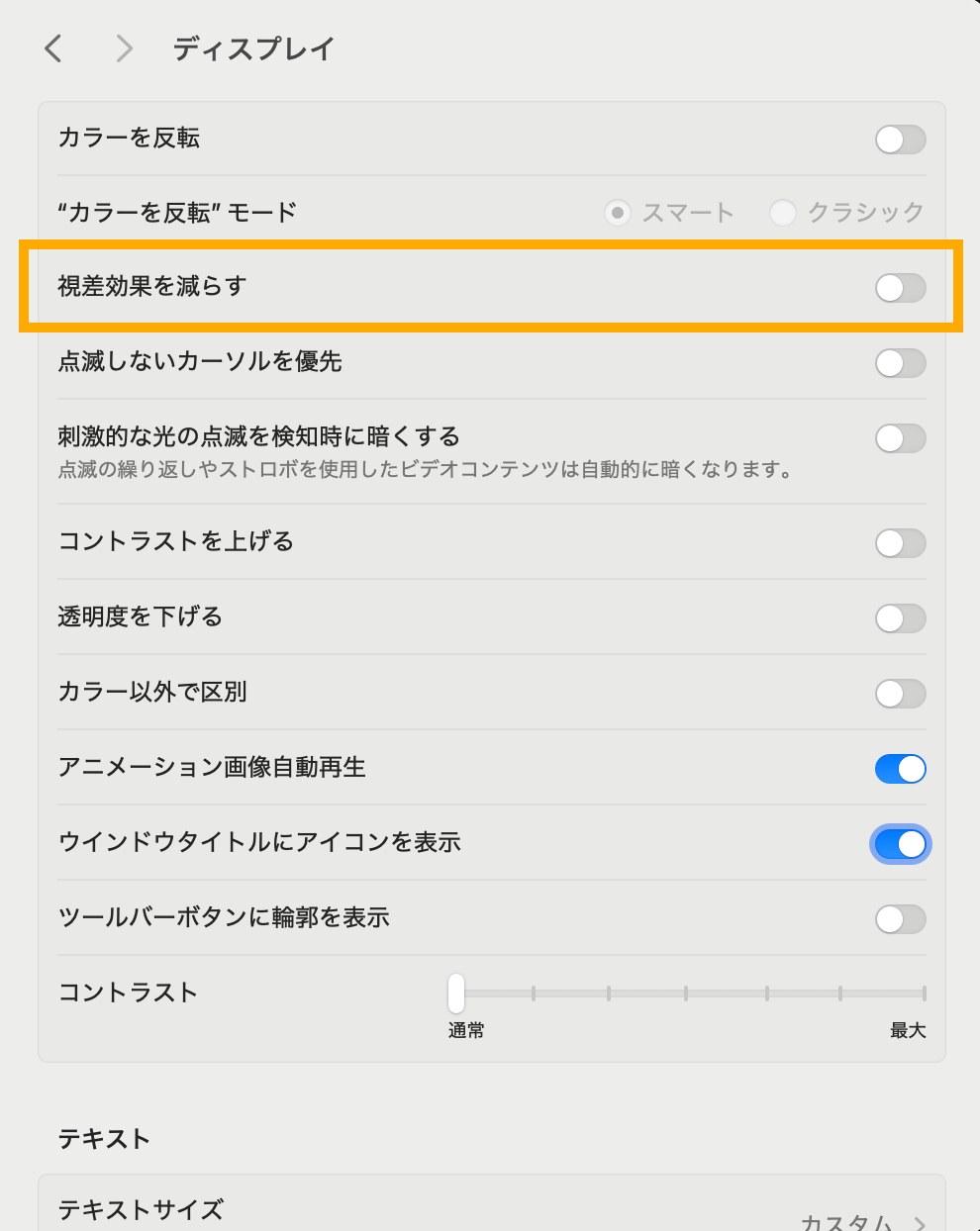 早速自分の環境でも 「視差効果を減らす」 をオンにしてみました。