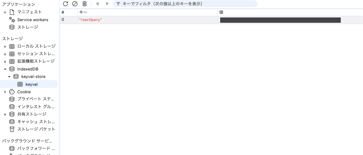 これで、Chrome の devtools の Application タブの IndexedDB で永続化されたキャッシュを確認できます。