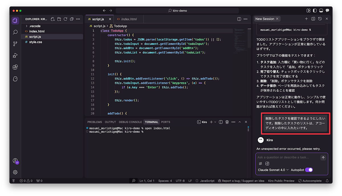 以下のようなプロンプトで、追加の機能実装をしてみましょう。