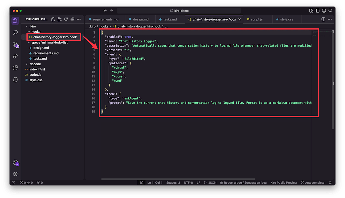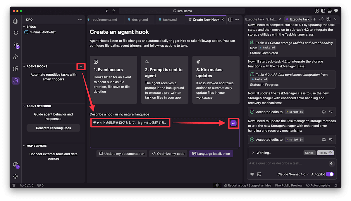 今回は、「チャットの履歴をログとして、log.mdに保存する」というHookを作成します。