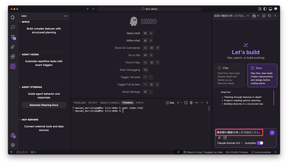 Kiroには、「Vibe」と「Spec」の二つの始め方があります。